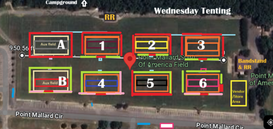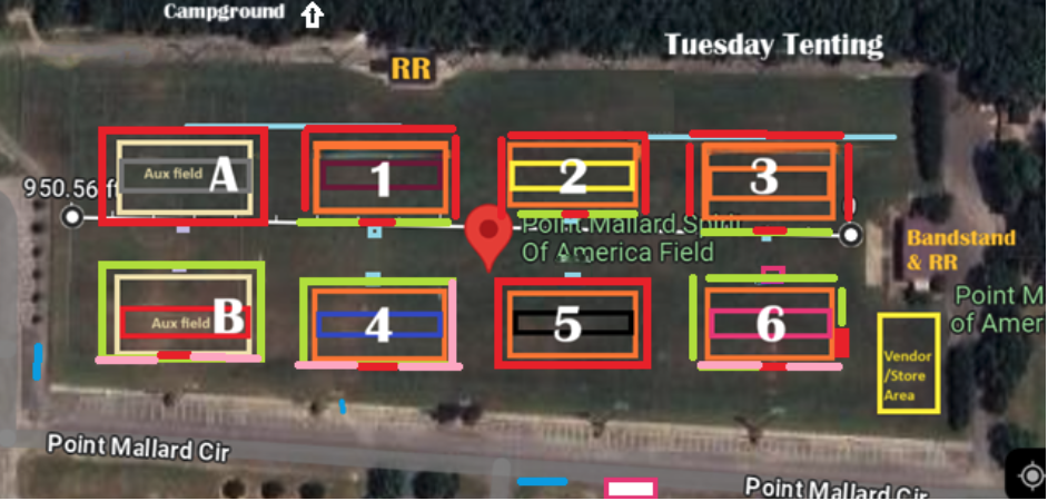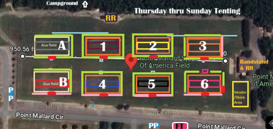 Detailed field maps showing tenting areas, restrooms, and field layouts are available. Maps vary by day due to different games being played.